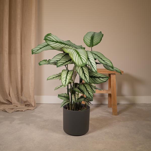 Die Calathea ist eine tropische Zimmerpflanze und wird auch als lebende Pflanze bezeichnet. Diesen Spitznamen verdankt die Calathea einer einzigartigen Eigenschaft. Die Blätter der Calathea schließen sich, sobald es dunkel wird, und öffnen sich wieder, sobald es hell wird. Die Calathea stammt aus den Dschungeln Südamerikas, wo die Pflanze an hohe Luftfeuchtigkeit gewöhnt ist. Sie können die Pflanze regelmäßig mit einem Pflanzensprühgerät besprühen. Am besten ist es, der Calathea regelmäßig kleine Mengen Wasser zu geben. Achten Sie darauf, dass die Blumenerde immer leicht feucht ist. Im Winter können Sie die Calathea etwas weniger gießen. Sobald die Heizung eingeschaltet wird, wird die Luft trockener. Die Calathea ist an trockene Luft nicht gewöhnt. Um zu verhindern, dass die Pflanze abstirbt, ist es wichtig, sie regelmäßig zu gießen. Der beste Standort für diese Pflanze ist im Halbschatten. Stellen Sie die Calathea an einen hellen Platz, aber nicht in die direkte Sonne. Bitte beachten Sie, dass es sich bei den Pflanzen um ein lebendes Produkt handelt, das von dem Foto und der Beschreibung abweichen kann. Unsere Pflanzen werden in einem Kunststofftopf geliefert. Alle Pflanzen werden direkt von der Gärtnerei verpackt und verschickt.