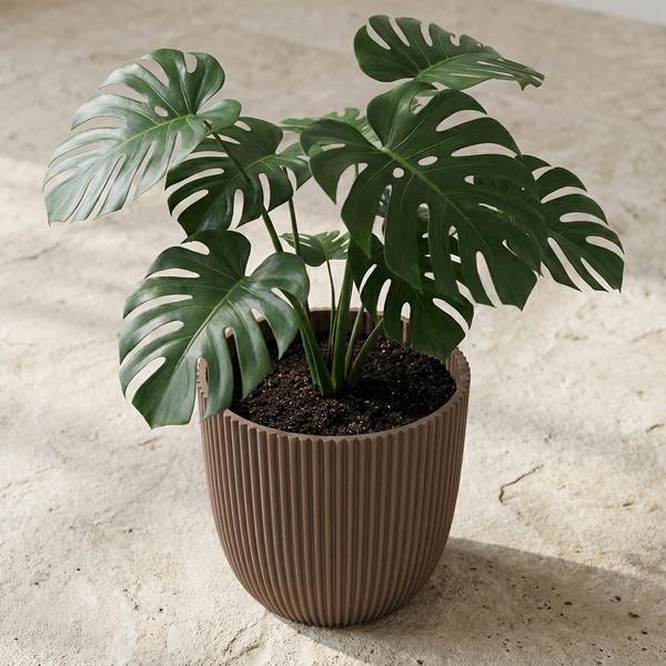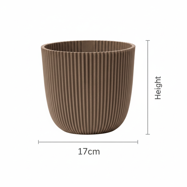 - Der Topf hat eine natürliche Rillenstruktur, inspiriert von Baumrinde und erdigen Formen.